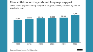 The number of five and six year olds who need speech and language support at school has risen by 10% in England over the past year, BBC analysis shows.