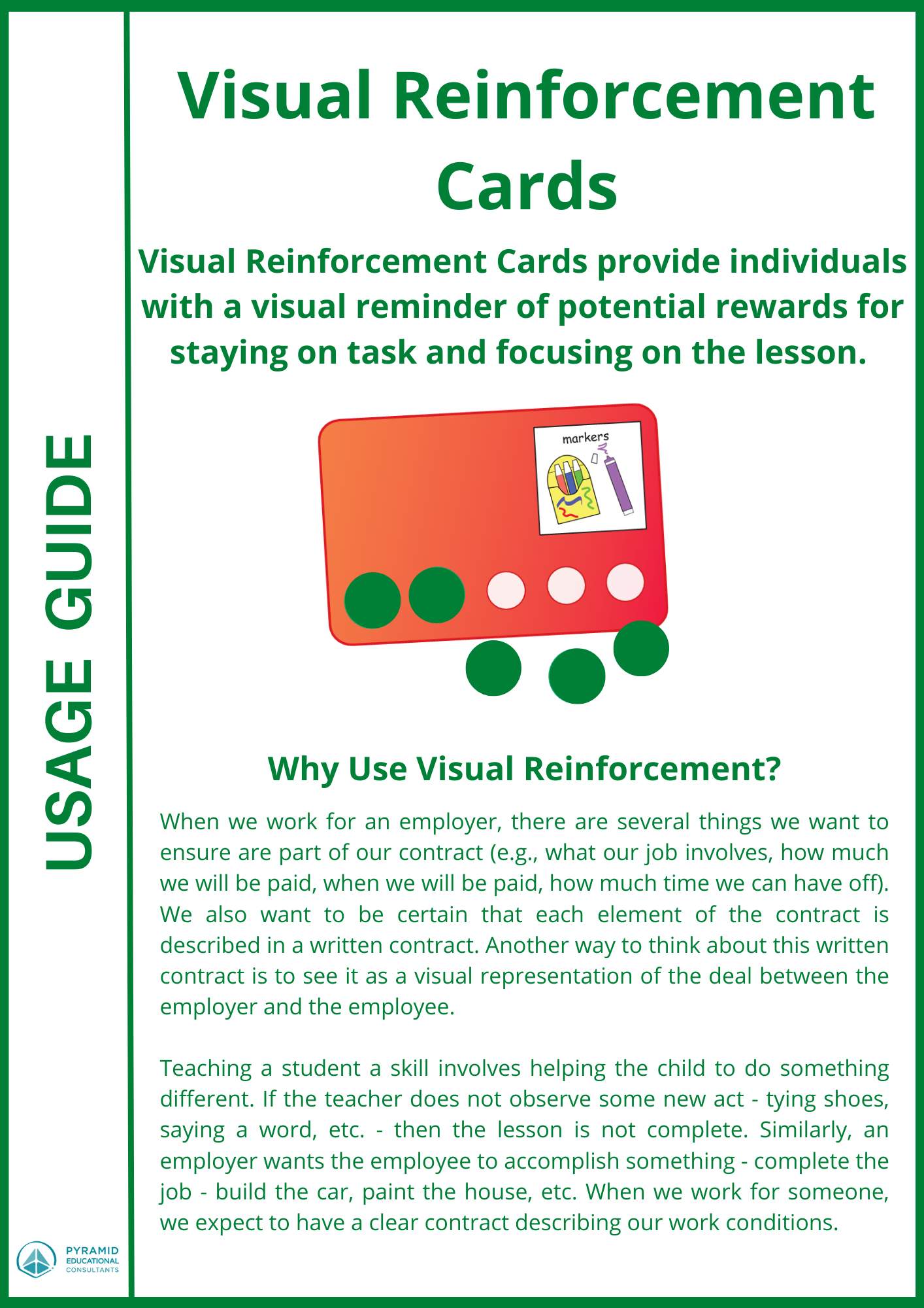 Visual Reinforcement Cards provide individuals with a visual reminder of potential rewards for staying on task and focusing on the lesson. Our large set of 5 cards – each measures 15.2cm x 12.1cm – is recommended when first introducing the system. For learners who have experience with the system, there is the small set of 3 cards, each measuring 12.1cm x 5.9cm. Set includes hook and loop fasteners, tokens and instructions. Token colour may vary from those pictured, and may present a choking hazard. Pictures sold separately. Some assembly required.
